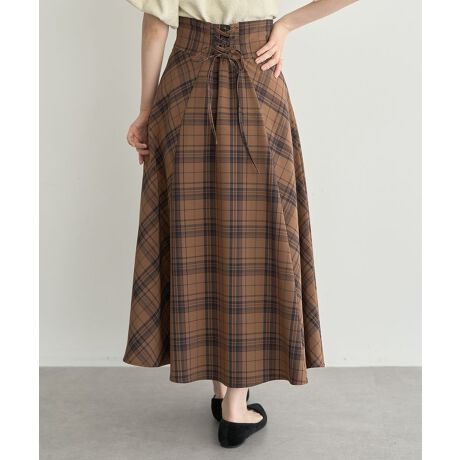 シックなチェック柄がシーズナルに着映えを叶えるロングスカート。ふんわりと広がるフレアシルエットにバックのレースアップが女性らしいデザインです。さらりと軽やかなテキスタイルに肌離れの良い裏地付きの快適な着用感も魅力的。シンプルなトップスに合わせるだけで印象的なスタイリングが決まるおすすめのアイテムです。