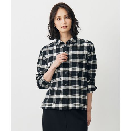■デザイン程よいゆとりと裾広がりのシルエットで、バランスよく着られるショートレングスのシャツブラウス。サイドスリットや前後差のある裾デザインが、前だけボトムスにインするような着こなしにも自然にマッチします。カラーは、クラシックで程よく華やかなオフ×ネイビー×レッドチェック(#302)、コーディネートに取り入れやすいブラック×オフチェック(#305)、落ち着きのあるカラーベースに明るさと華やぎを添えたネイビー×オフ×イエローチェック(#375)の3色展開です。