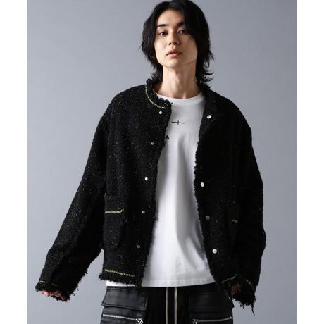 ラグジュアリーな風合いのツイード素材をベースに、全体をカットオフ仕様で仕上げ、裾やポケットの淵にゴールドのチェーンを飾ったノーカラージャケット。