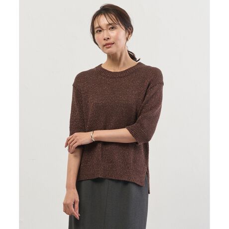 ■デザイン控えめなラメ感が、品のある華やかさを演出してくれるラメニット。肘が隠れるほどのやや長めの袖丈は、気になる二の腕をさりげなくカバーしつつ、晩夏から秋にかけて活躍する絶妙なバランスです。シルエットはコンパクトになりすぎず、インでもアウトでもきれいに決まるサイズ感が魅力です。1枚で着てもサマになり、ジャケットのインナーとしても重宝する、季節の変わり目に頼れるニットです。カラーは、ベーシックで大人なシルバーグレー(#003)、落ち着いた雰囲気で肌なじみのいいシャンパン(#033)、上品で落ち着きのあるダークブラウン(#035)の3色展開です。