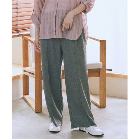 メランジ調のジャージー生地で仕立てたカジュアルなデザインパンツ。伸縮性に優れたリラクシーな穿き心地ながら、センターシームのすっきりとしたレッグラインが特徴的です。ウエストゴム仕様にタックアクセントを加えたコンフォートなフィット感も魅力。カットオフの裾や、チャームやカラビナを装着出来るサイドループもさり気ないポイントです。