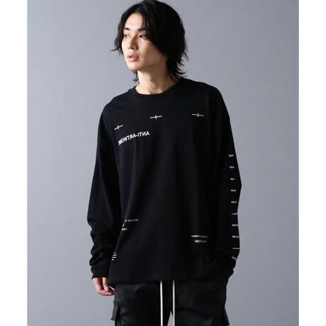 随所にレタリングロゴやタイポグラフィを配置したロングスリーブTシャツ。