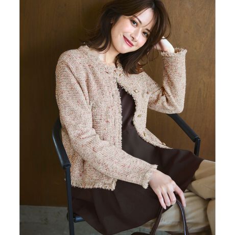布帛のような上品な見た目のクルーネックニットツイードジャケット。襟元、前立て、袖口にあしらわれた共糸のフリンジがアクセントになり、洗練された印象を与えます。胸元には共糸のポケットを配し、ゴールドボタンが煌めきを添えます。軽やかな着心地ながらも、きちんと感を演出してくれるので、きれいめなお出かけから普段使いまで幅広く活躍。秋口にはTシャツやブラウスに羽織ったり、寒くなればコートインとしても着やすいサイズ感です。着るだけでコーディネートが華やぐ、大人の女性にぴったりの一枚です。カラーは、清潔感のあるアイボリーミックス(#302)、こなれ感を演出するオレンジミックス(#320)、洗練された雰囲気のブルーミックス(#370)の3色展開です。