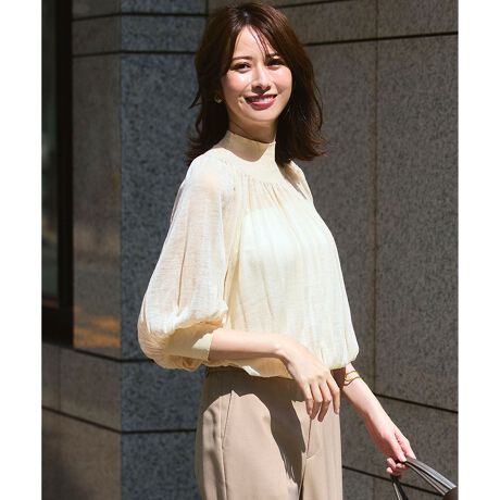 薄く透け感のある編地にギャザーをたっぷりと施し、まるでブラウスのような軽やかな印象に仕上げたニットトップス。ハイネックデザインが首元をすっきりと見せ、ギャザーのおかげで身体に張り付くことなく、快適に着用いただけます。まだ暑さが残る時季から活躍するニットなので、晩夏や初秋のコーディネートに最適。一枚で華やかな着こなしが完成し、ボトムスを選ばない万能アイテムです。カラーは、ニュアンス感のあるライトグレー(#003)、印象引き締まるブラック(#005)、やわらかな印象のベージュ(#033)の3色展開です。