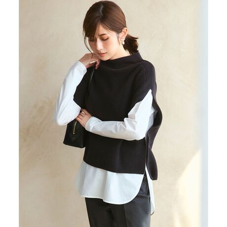畦編みで仕立てたニットベストです。モックネックのデザインが上品さを演出し、肩を優しく包み込むようなシルエットがポイント。脇は開いていますが、スナップボタンが付いているのでずれる心配がなく、快適に着用いただけます。前をタックインして、シャツやカットソーなどとのレイヤードスタイルもおすすめ。シンプルながらも洗練されたデザインで、着こなしに奥行きを与え、幅広いコーディネートを楽しめます。カラーは、やわらかな印象のアイボリー(#002)、抜け感のあるライトグレー(#003)、印象引き締まるブラック(#005)、こなれ感のあるダークブラウン(#035)の4色展開です。