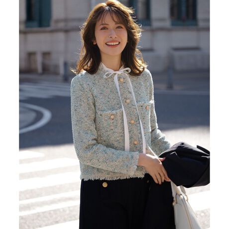 ニット素材で軽く、気軽に羽織れるのに布帛のような上品さを叶えるクルーネックニットツイードジャケット。襟元、前立て、袖口にあしらわれた共糸のフリンジがアクセントになり、洗練された印象を与えます。胸元には共糸のポケットを配し、ゴールドボタンが煌めきを添えます。軽やかな着心地ながらも、きちんと感を演出してくれるので、きれいめなお出かけから普段使いまで幅広く活躍。春先や秋口などの季節の変わり目には、Tシャツやブラウスに羽織ったり、肌寒い日にはコートインとしても着やすいサイズ感です。着るだけでコーディネートが華やぐ、大人の女性にぴったりの一枚です。カラーは、清潔感のあるアイボリーミックス(#302)、こなれ感を演出するオレンジミックス(#320)、洗練された雰囲気のブルーミックス(#370)に、春のファッションを彩る新色として可憐な雰囲気のピンクミックス(#312)、印象引き締まるライトグレーミックス(#303)、爽やかなスカイブルーミックス(#372)が加わり、全6色展開です。