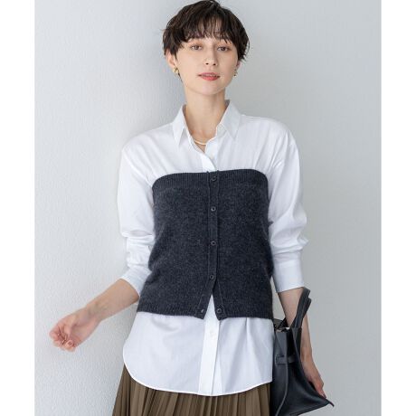 秋らしい温かみを感じさせる、ラクーン混のニットビスチェです。シアーブラウスやシャツ、Tシャツなどの上に重ねるだけで、旬のレイヤードスタイルが完成します。肩紐はありませんが、胸周りのリブ部分にストレッチ糸を入れているため、胸元でしっかりとフィットし、ずれにくい設計です。いつものトップスにプラスするだけで、ぐっとこなれた印象になり、コーディネートの幅が広がります。