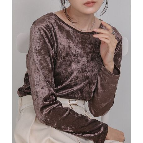 夏に大人気だったカットソーが長袖になって登場しました!ベロアならではの柔らかな手触りと光沢が特徴で、程よいシアーなので軽やかに着用いただけます。後ろ姿もオシャレな背面の切り替えラインでひと癖◎トップスとしてもインナーとしてもお使いいただけるアイテムです。
