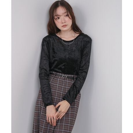 夏に大人気だったカットソーが長袖になって登場しました!ベロアならではの柔らかな手触りと光沢が特徴で、程よいシアーなので軽やかに着用いただけます。後ろ姿もオシャレな背面の切り替えラインでひと癖◎トップスとしてもインナーとしてもお使いいただけるアイテムです。