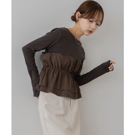 ビスチェを重ね着しているようなレイヤードデザインが目を惹くロンT。トップスの下部分にたっぷりと別素材の生地をあしらい、ふんわりとしたバルーンスカートのようなシルエットを描きます。一枚でコーデが完成する華やかさがありながらも、ロンTの着やすさを兼ね備えた、デイリーに取り入れやすいアイテムです。