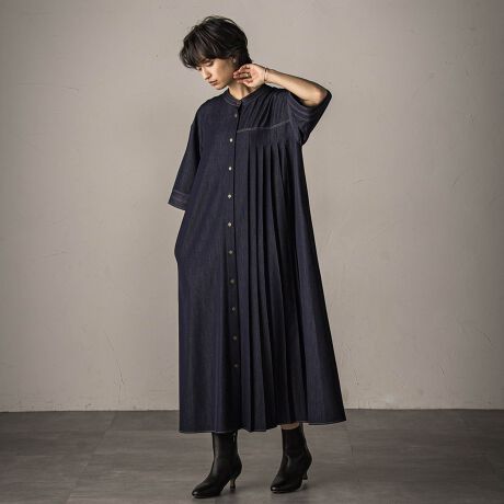 アシンメトリーのプリーツと、配色ステッチがアクセントになった、一枚でサマになるデザイン。