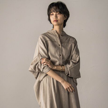 リラックス感と今っぽさを感じさせる、とろみカラーデニムのドルマンシャツ。