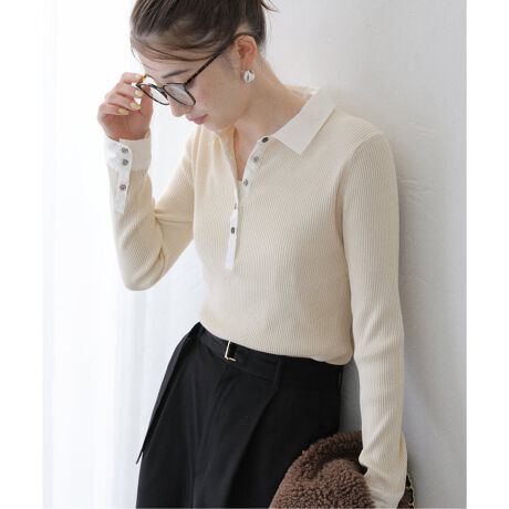 シャツをレイヤードしているような襟とカフスのデザインがクリーンな印象を与えるドッキングニット。
