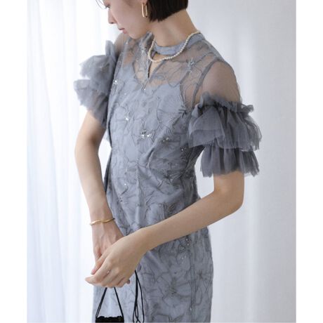 チュールレースと小粒のスパンコールが華やかなゲストドレス。