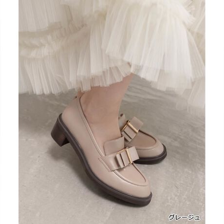 フロントに施したリボンパーツが印象的なヒールアップローファー。