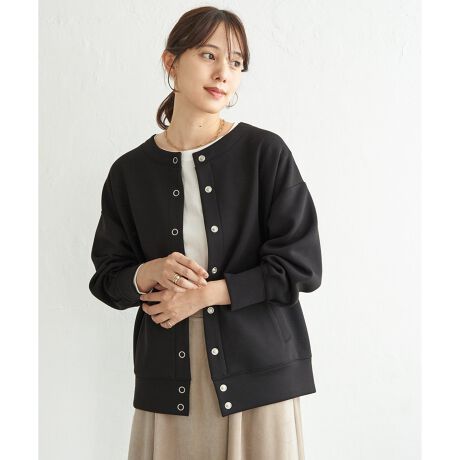 ノーカラーのすっきりとしたネックラインに、大ぶりのリングドットボタンがアクセントを添えます。