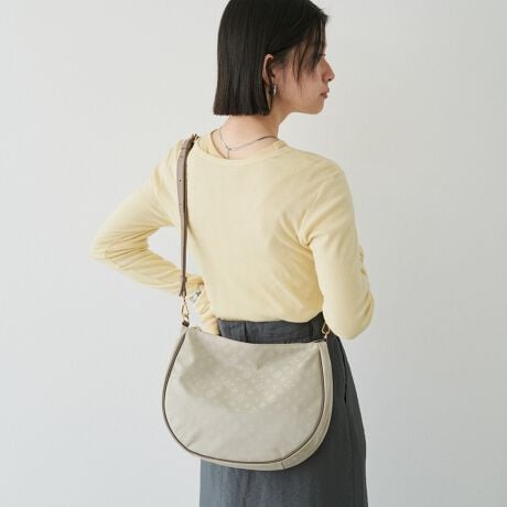 ほんのり丸みを帯びたシルエットがやさしい印象を添える、モノグラム柄のショルダーバッグ。