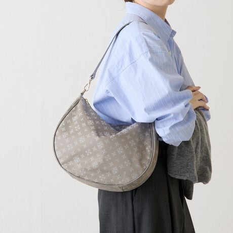 ほんのり丸みを帯びたシルエットがやさしい印象を添える、モノグラム柄のショルダーバッグ。