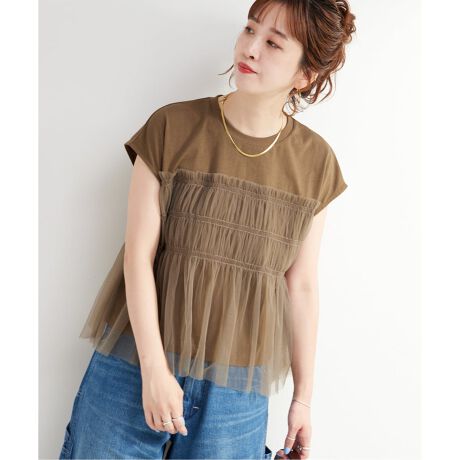 ナチュラルなショルダーラインになるフレンチスリーブシルエットのカットソーに、シャーリングを寄せたチュール素材をドッキングしたプルオーバーです。カットソーで着心地は楽に、ハリのあるチュール素材で華やかに着映えするデザイン。