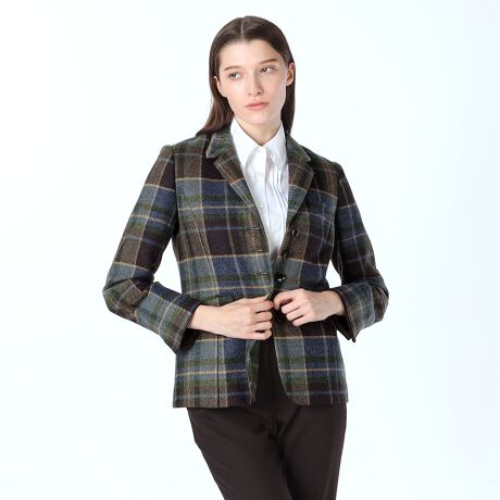 ウォーム感があるツイード生地のテーラードジャケット。チェック柄や5つボタンのフロントがクラシカルな印象です。すっきりとしたシルエットとほどよい丈感はさまざまなボトムスと好相性。ロゴ入りのボタンや裏地の部分的なペイズリー柄など、細部にまでこだわりが十分です。同素材のスカートもございます。