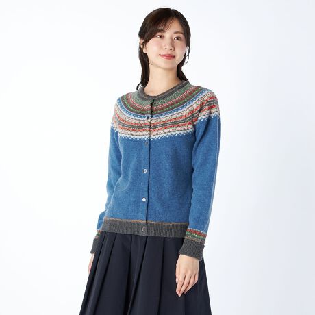 レトロな雰囲気が魅力の丸ヨークデザインのニットカーディガン。細糸を丁寧に編み立てたことで柄がくっきりと表現されています。柄によって顔回りが華やかに見えるのもポイントです。フロントボタンを留めてプルオーバー風に着こなすのも素敵なアレンジ。長すぎない着丈でパンツともスカートとも合わせられます。