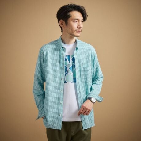 ジャージ素材のシアサッカーギンガムチェックを使用したON/OFF使いができるベーシックデザインの長袖のシャツです。