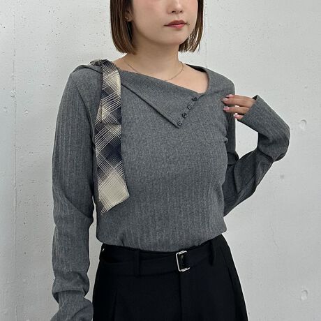 アシメなネックラインとボタンデザインで、周りと差がつくおしゃれ感を演出します。