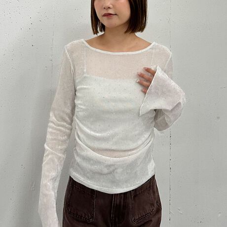 透け感のあるメッシュベロア素材にラインストーンを散りばめた華やかなトップス。