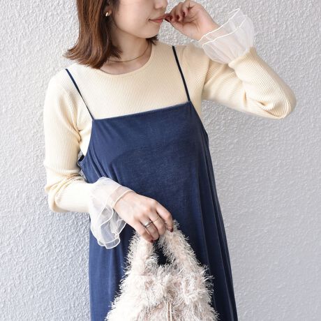 袖のチュールがアクセントになったリブニット。
