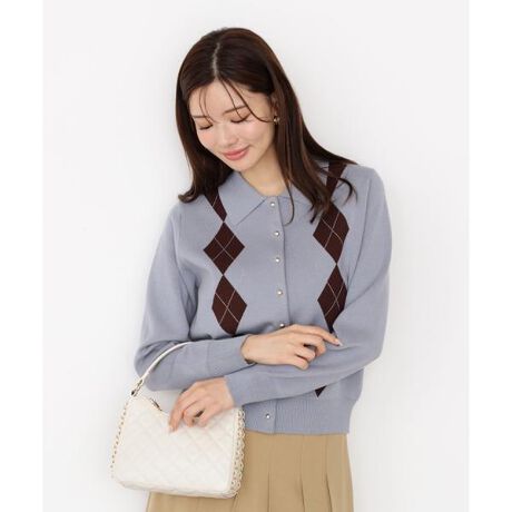 トレンドのアーガイル柄を取り入れた襟付きニットです。かしこまりすぎないよう、ラメ糸を使ってラインを入れたデザイン。詰まりすぎない襟なのでオトナ可愛く着こなせます。