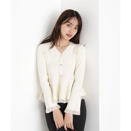 フロントの飾りボタンがポイントのペプラムニットです。裾は前後差をだした着丈にし、気になる腰まわりをカバーしながら着やすさも両立。袖口と裾は異なる糸でシアー感を出しているのでロングシーズン着用いただけます。