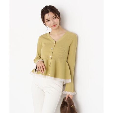 フロントの飾りボタンがポイントのペプラムニットです。裾は前後差をだした着丈にし、気になる腰まわりをカバーしながら着やすさも両立。袖口と裾は異なる糸でシアー感を出しているのでロングシーズン着用いただけます。