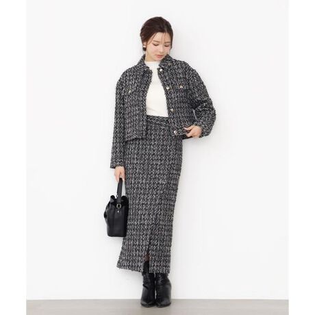ラメツイード生地を使用したナロースカートです。ラップ風ディテールを活かしながら、裾はスリットを入れており、重たく見えないデザインに。トップスの裾をINする着こなしがおすすめ。同シリーズのブルゾンを合わせ、セットアップとしても着ていただけます。