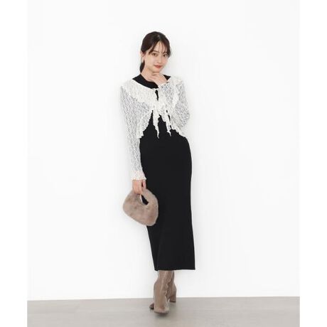 カットレースの短丈カーディガンとニットワンピースのSETです。ボレロタイプのカーディガンは、フロントフリルと細リボンが華やかに見せてくれます。シンプルなニットワンピースと合わせるだけで、コーディネートがおしゃれに決まります。