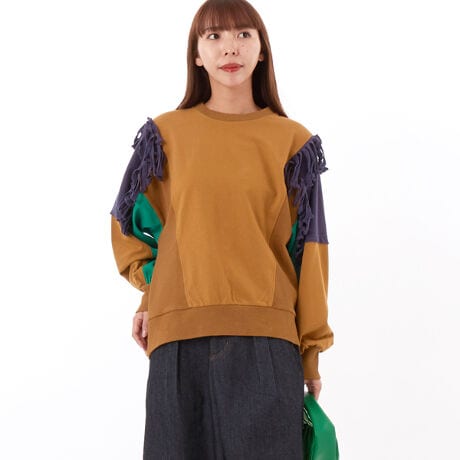 【素材】綿特有の肌触りの良さと適度なハリと肉感が特徴の裏毛素材と配色のフライスを組み合わせています。【デザイン】ゆったりとしたワイドシルエットに広めの袖ぐりでリラックスしたシルエットに仕上がったトレーナーは、大胆なカラーブロックの切り替えと共生地をカットオフしてフリンジ状に付けたデザインがアクセントになっています。目を引く配色とフリンジで軽やかさの中にモードな雰囲気を出しています。 *フリンジ部分は繊細な為、ほつれやすい仕様をあえて取り入れています。お洗濯の際はネット洗いをお勧めします。また、ほつれた糸は無理に引っ張らずにカットしてください。*こちらの商品はユニセックス商品です。【ブランド情報】FRAPBOIS/フラボア2001年にブランドスタート。「大人げない大人の服」をコンセプトに、大人が着るリラックスしたデイリーウェアを提案するコレクションブランド。レディースとメンズのアイテムをご用意しています。