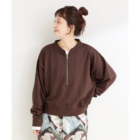 裏毛素材を使用したトレンド感あるハーフジップ仕様のスウェットトップス。