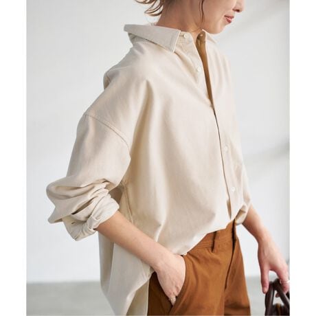 シャツコールの生地にタンブラーをかけて、くたっとした落ち感が出るまで柔らかくした素材を使用しています。