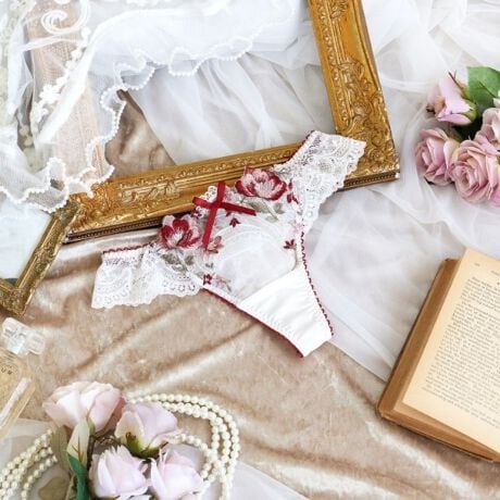 バラのお花と扇形模様を組み合わせた、豪華でエレガントなシリーズです。レース全体に咲きほこる大輪のバラは、大胆なカラーリングでインパクトを持たせつつも、女性らしい印象に。周りには様々な小花の刺繍をあしらい、可愛らしさをプラスしました。扇状に描かれた模様は扇の線1つ1つに変化をつけ、2色のラメ糸をふんだんにほどこすことで、バラの存在感を引き立てたより一層の華やかさを演出。豪華なエンブレースが生み出す調和が、身に着けるたび心をときめかせてくれるようなランジェリーに仕上がりました。