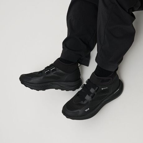 オールブラックの配色は、同じくブラック系のシェルやテックパンツと組み合わせて、都会的なアーバンアウトドアスタイルに仕上げるのもおすすめです。