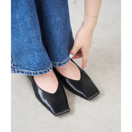 トウの先端にステッチ+小さめのスタッズを施し、程よくモードな印象で履けるフラットシューズ。