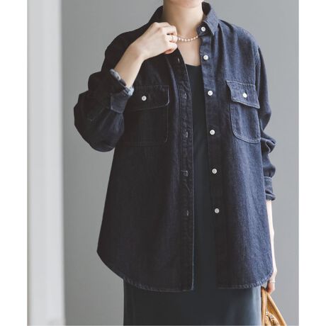 シルクのような光沢と柔らかい肌触りが特徴のリヨセル混の素材で作られたデニムシャツは軽くて適度に身体に馴染むシルエットで女性らしさが引き立つシルエット。