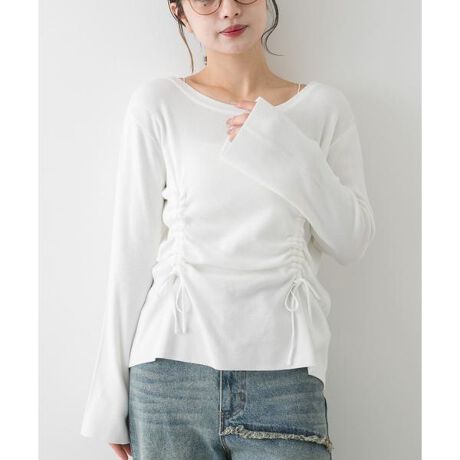 シャーリングデザインが目を引くニット。デコルテが綺麗にに見えるボートネックで袖は少しフレアになっており、女性らしい印象です。シンプルにデニムで合わせても決まる一枚着トップス。