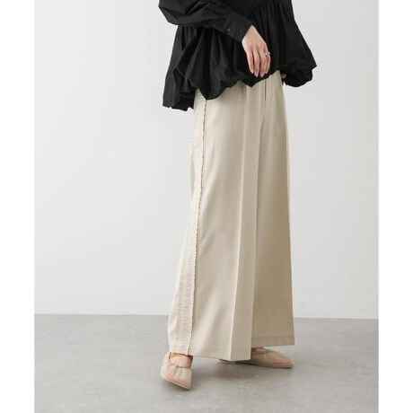 羽織シャツ+コンパクトインナー+パンツのルーズな着こなしがおすすめのサイドフリルパンツ。