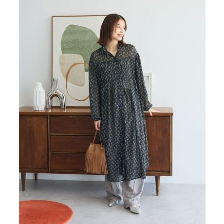 落ち感のある楊柳シフォン素材に小花柄が映えるロングワンピース。前後にギャザーを施した立体感のあるシルエットやフェミニンなフリル衿が女性らしいスタイリングを演出します。前ボタンを開けてロングカーディガンとしても活躍。いつものコーディネートにさらっと合わせるだけで今季らしいレイヤードスタイルが完成するおすすめのアイテムです。透け感[あり]