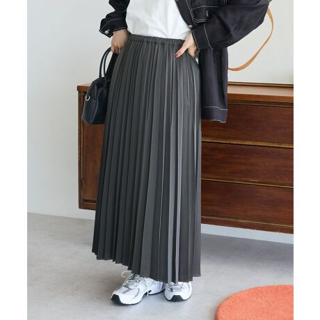 光沢感のあるサテン調素材で仕立てた品のあるスカート。動くたびに揺れ動く優しいニュアンスが女性らしいさを上げてくれる旬なデザインです。腰回りのピッチを変えた変形プリーツがすっきりとしたシルエットを演出。ウエストゴム仕様で楽に着脱出来、軽い穿き心地なのも嬉しいポイントです。透け感[なし]