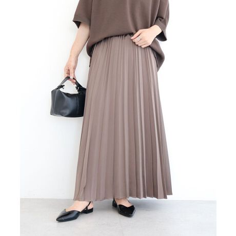 光沢感のあるサテン調素材で仕立てた品のあるスカート。動くたびに揺れ動く優しいニュアンスが女性らしいさを上げてくれる旬なデザインです。腰回りのピッチを変えた変形プリーツがすっきりとしたシルエットを演出。ウエストゴム仕様で楽に着脱出来、軽い穿き心地なのも嬉しいポイントです。透け感[なし]