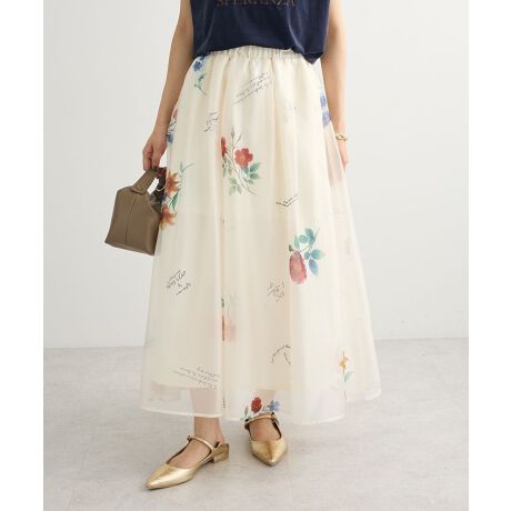 ニュアンスあるフラワープリントを施したシアー生地のフレアスカート。エアリーに揺れ動く軽やかな雰囲気がスタイリングに甘さをプラスするレディなデザインです。ウエストギャザーゴムで着脱しやすく、光沢裏地でより品良く演出。シンプルなTシャツからフェミニンなニットアイテムまで幅広く合わせていただけるおすすめのアイテムです。透け感[あり]