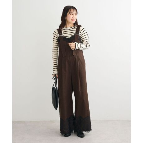 ベルトストラップが個性的なスタイリッシュなオールインワン。トップや裾に施したカットレースのトリムが斬新でお洒落なデザインです。バックシャーリングにジップ開閉で着脱しやすくフィット感も抜群。しっかりとしたテキスタイルでカジュア過ぎず、上品なスタイリングに仕上げてくれる今季おすすめのアイテムです。透け感[なし]