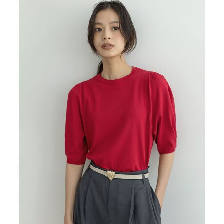 ■デザイン・5分袖のタックスリーブがシンプルで映える万能プルオーバー。・裾は絞らず袖口はシンプルな袋天竺始末でTシャツの様なすっきりとした印象に。・詰まったクルーネックデザインがエレガントな印象。・バックスタイルに共布のクルミボタンとアウトシームをあしらい、後ろ姿も抜け目なく。