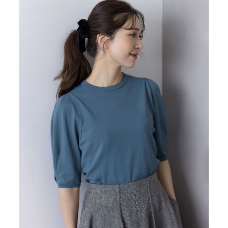 ■デザイン・5分袖のタックスリーブがシンプルで映える万能プルオーバー。・裾は絞らず袖口はシンプルな袋天竺始末でTシャツの様なすっきりとした印象に。・詰まったクルーネックデザインがエレガントな印象。・バックスタイルに共布のクルミボタンとアウトシームをあしらい、後ろ姿も抜け目なく。